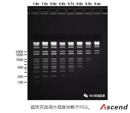 XP磁珠体系中包含:磁珠、聚乙二醇(PEG)、以及盐离子等,在一定浓度的PEG和盐离子环境中,DNA可吸附到羧基修饰的高分子磁珠表面(即固相载体),该过程是可逆的,在适当条件下,结合的DNA分子可以被洗脱回收。构建过几次文库的,就很清楚自己要大多片段的文库,改用多少成XP去双选。