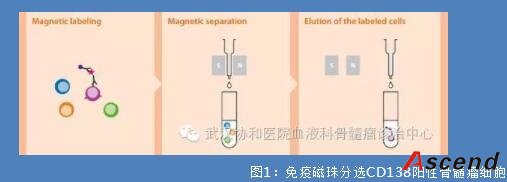 MM细胞基本都为CD138阳性细胞,据此我们使用CD138磁珠结合至MM细胞(如图3所示紫色细胞)上,经过磁场时,没有结合磁珠的细胞被洗脱,撤去磁场后收获细胞,所得到的均为CD138阳性细胞,即MM细胞。这个方法可以富集骨髓中的异常浆细胞,大大提高检测的敏感性和特异性。