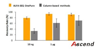 相比传统过柱法纯化,ASPure MagBeads回收率更高,重复性更好,耗时更短